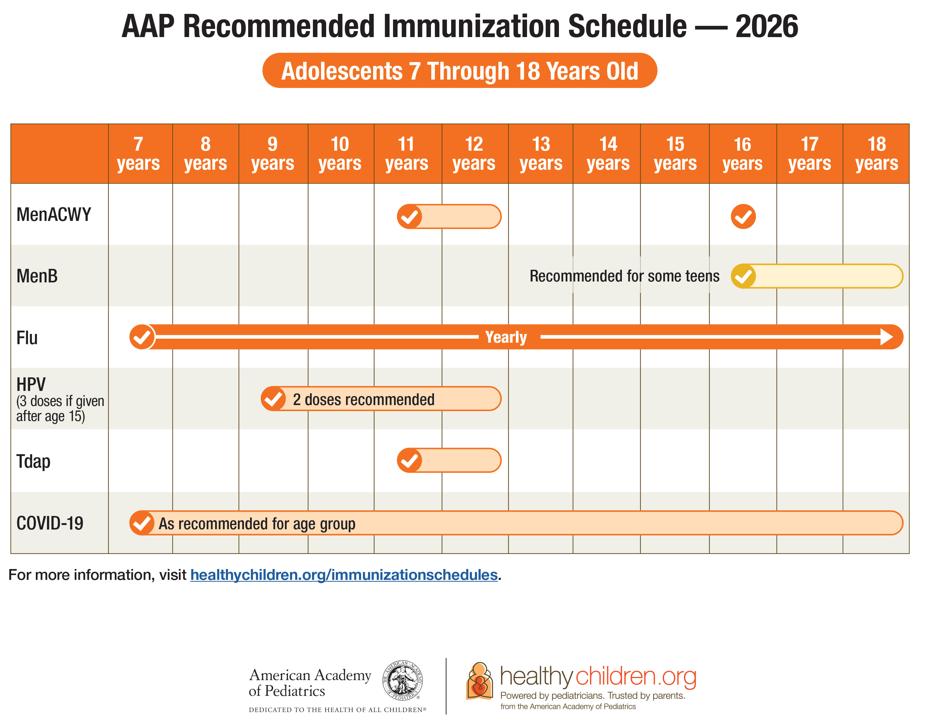 See which vaccines your child needs from ages 7 through 18 in this parent friendly immunization schedule.
