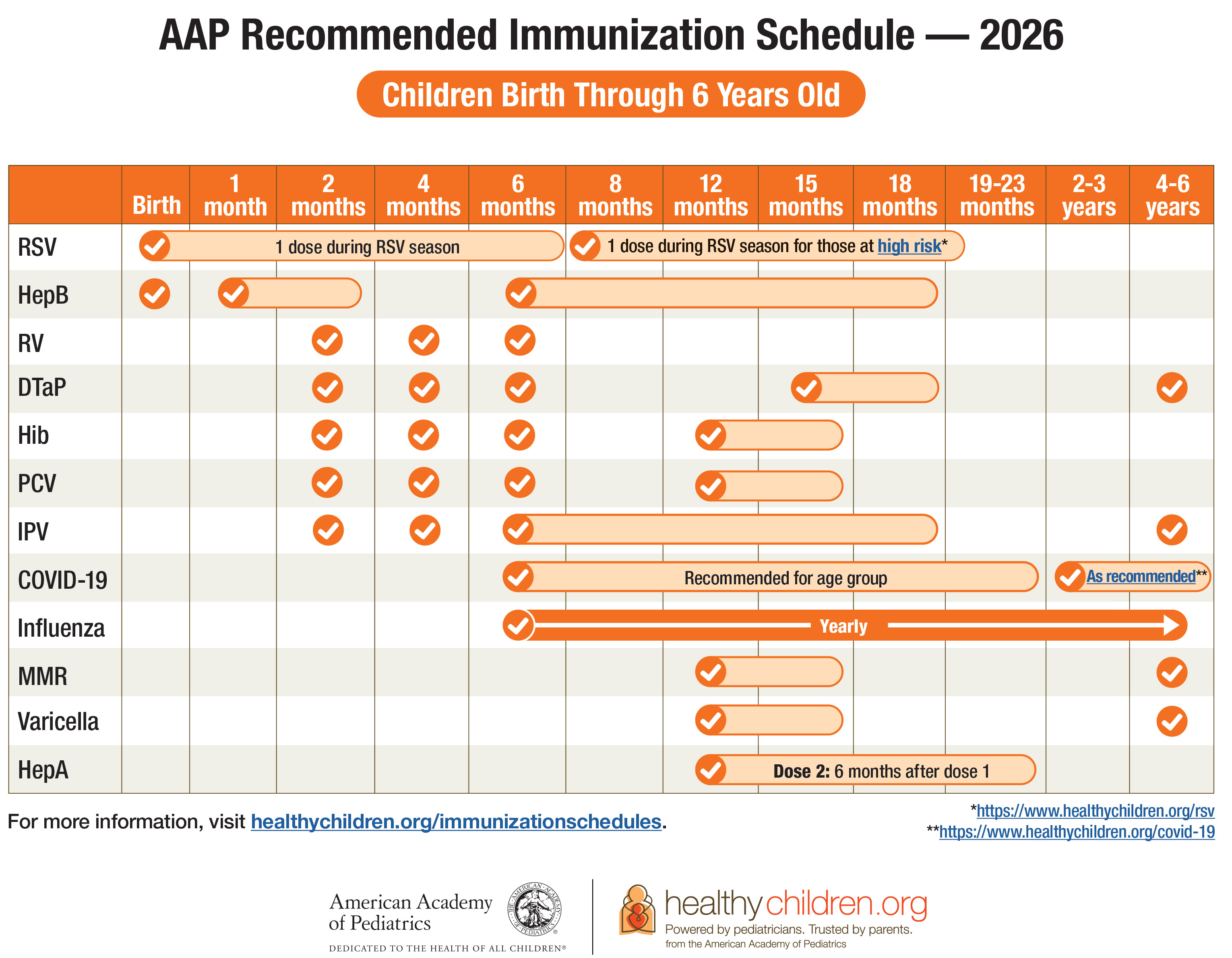 See which vaccines your child needs from birth through age 6 in this parent friendly immunization schedule.